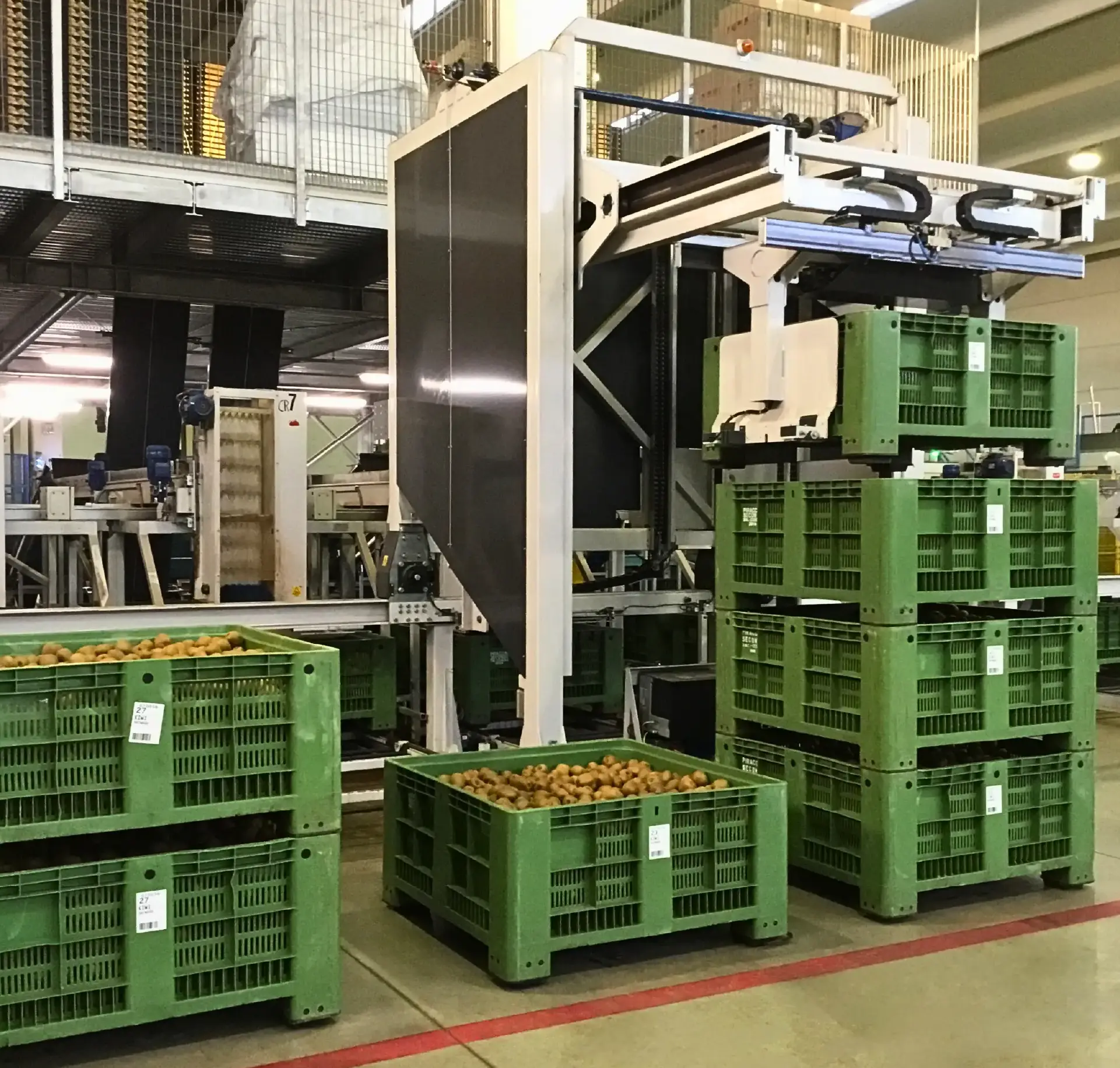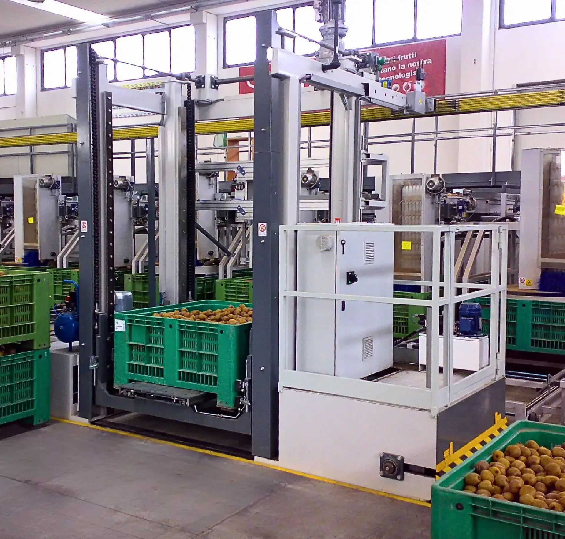 Our palletizing systems for the fruit and vegetable sector organize crates and cartons into selected layers on pallets ensuring stability and safety during transport and storage. Specifically, the Airone team creates both traditional layer systems and and more advanced solutions with anthropomorphic, suitable for managing complex and variable productions.